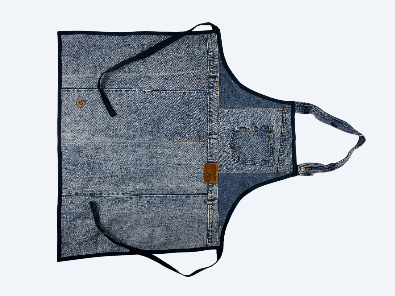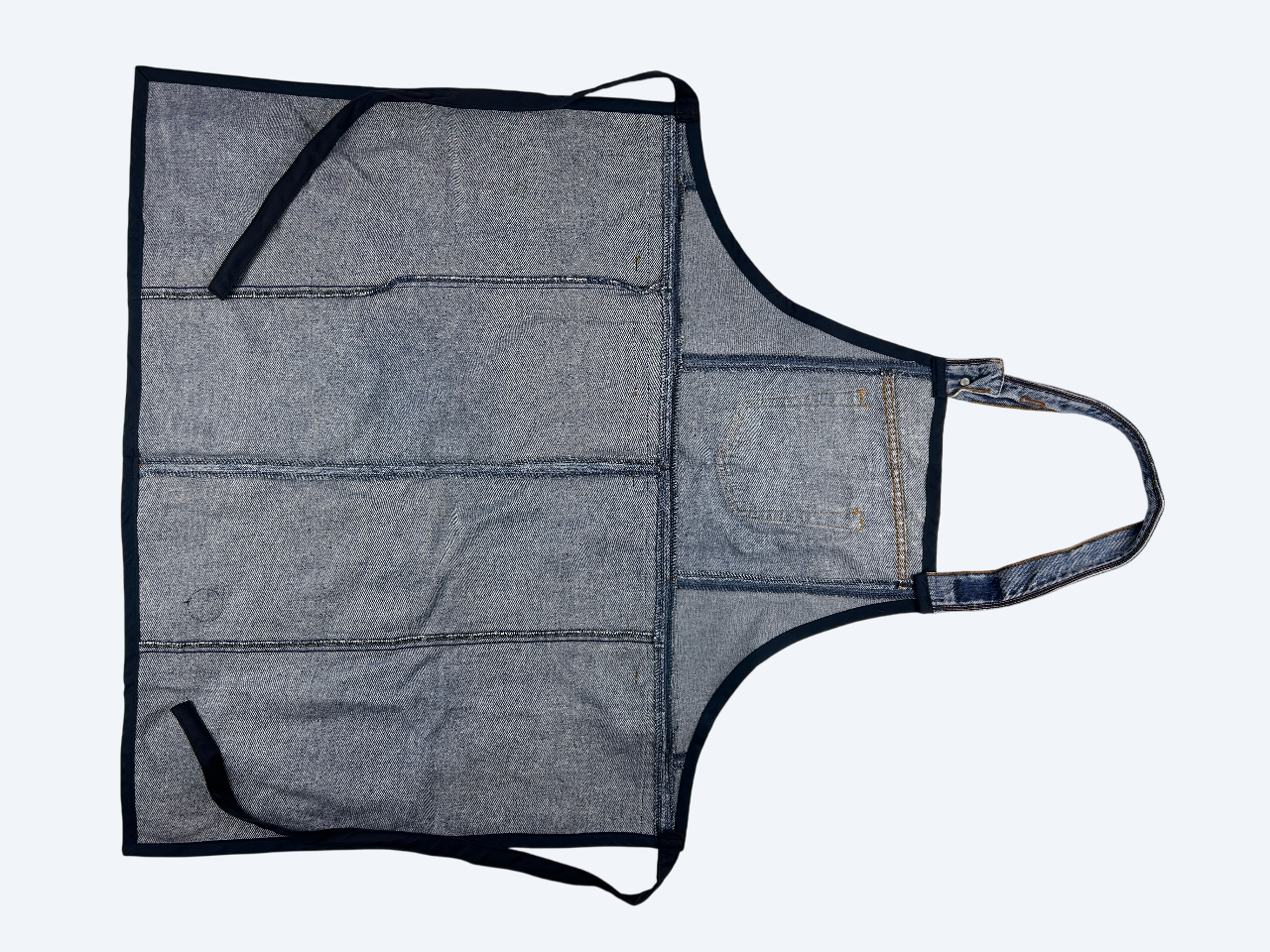Het schort is gemaakt van blauwe oude jeans en aan de achterkant netjes afgewerkt. De zijkant is afgezet met biasband. De band voor de nek is van een broekband gemaakt en heeft een extra knoopsgat waardoor de band verstelbaar is. Dit schort heeft nog een extra groot vak waar je nog wat in kan doen.