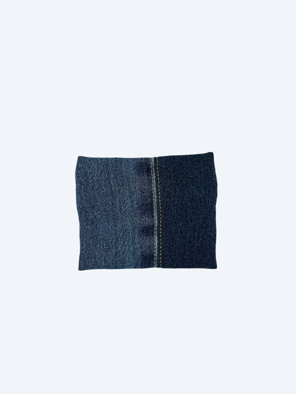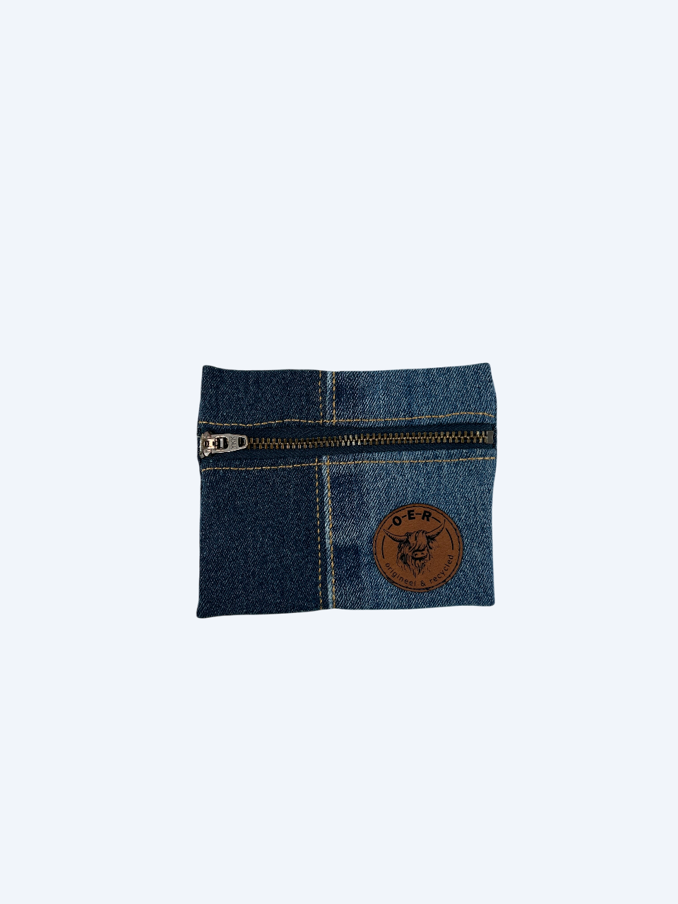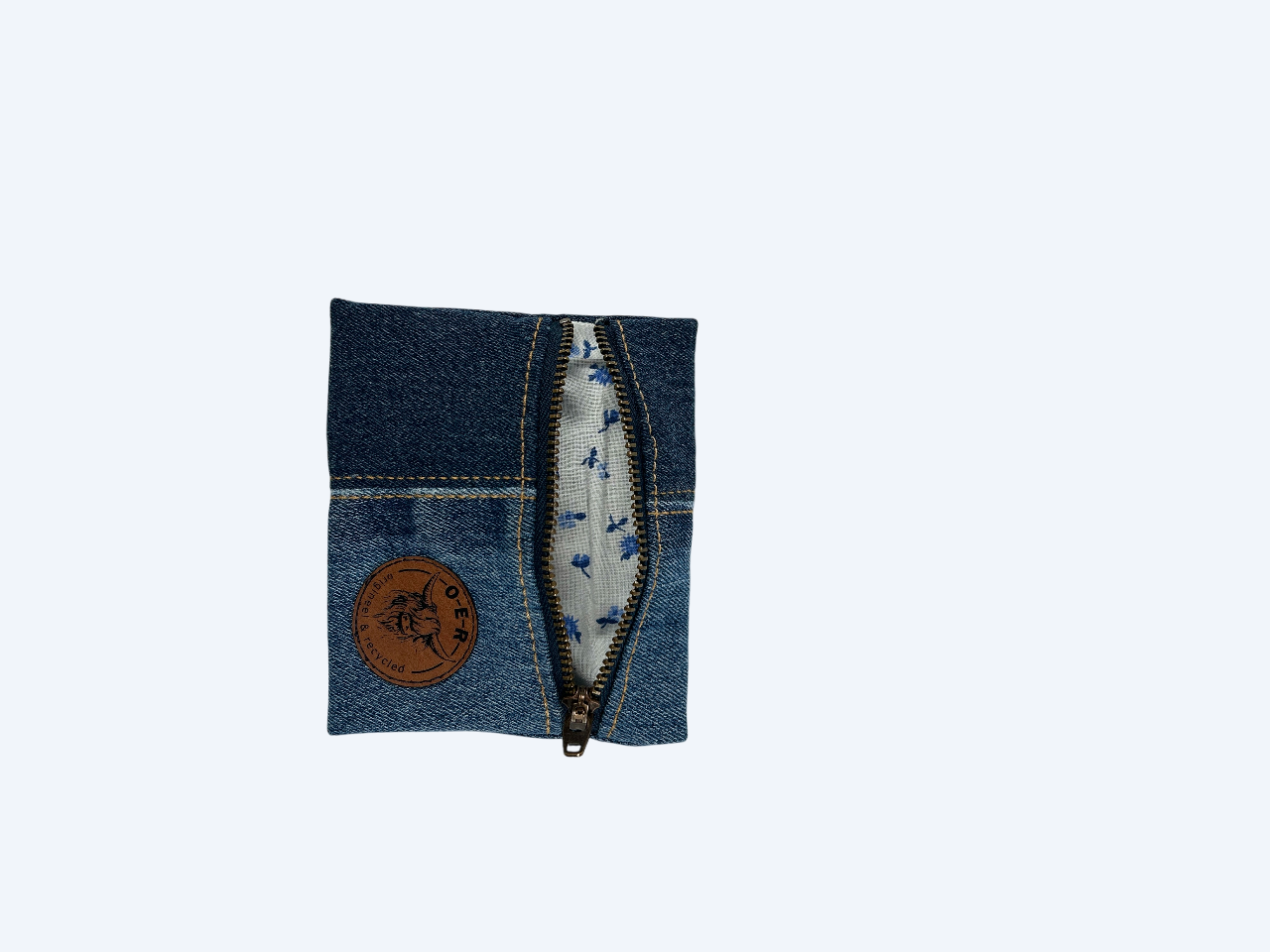 De portemonnee is gemaakt van restanten jeans. Ook de rits komt uit een jeans. Hij bevat een voering van katoen.