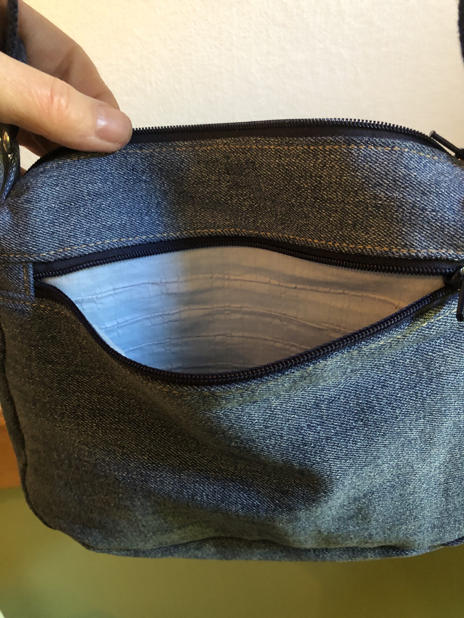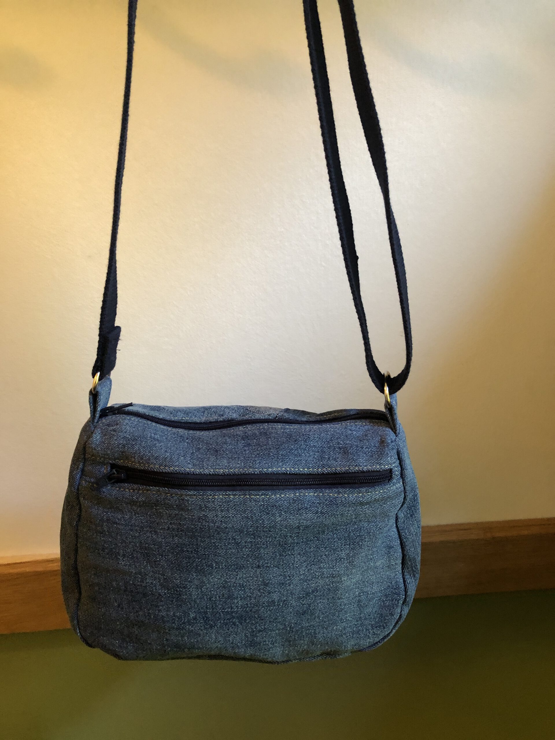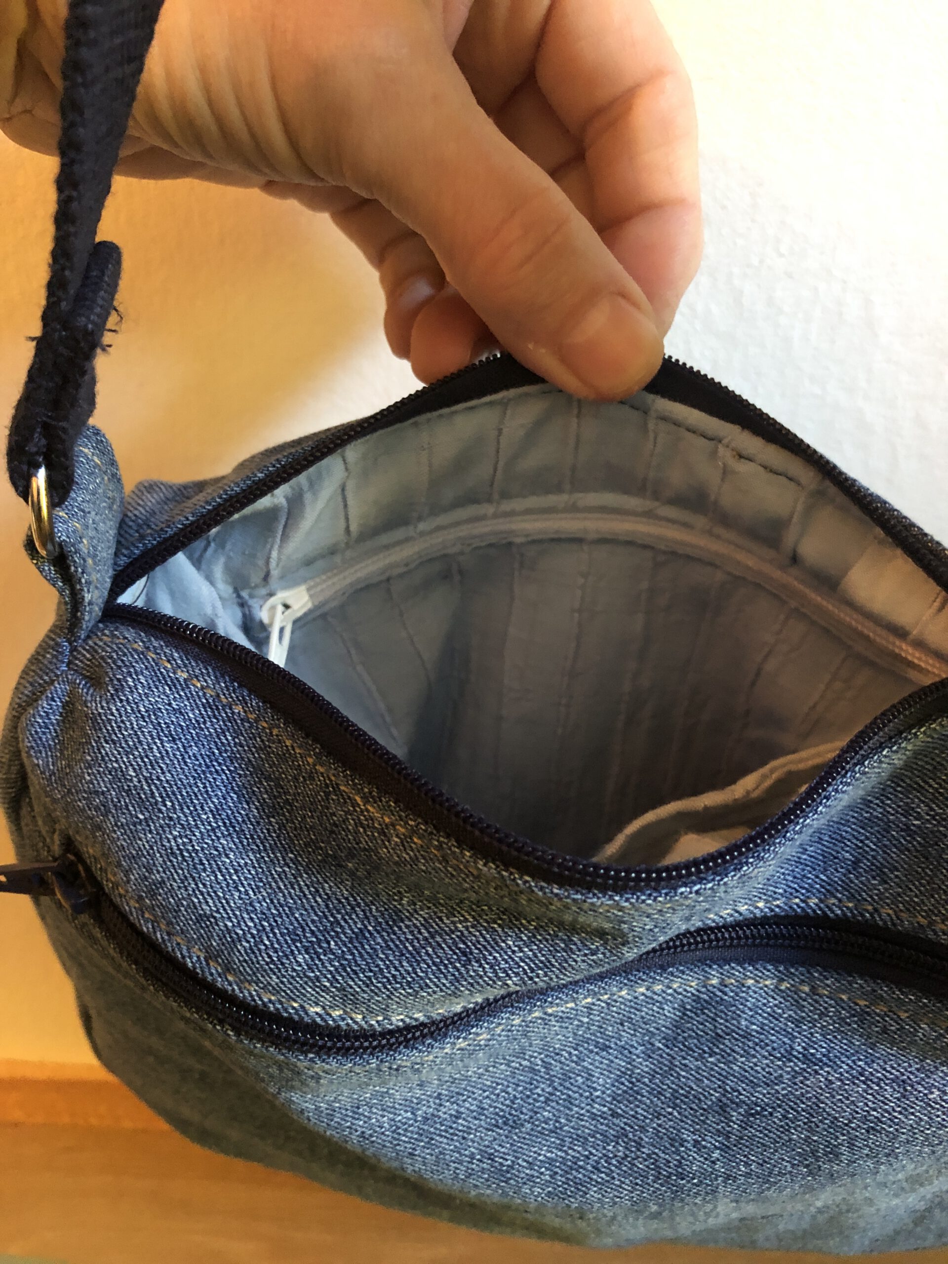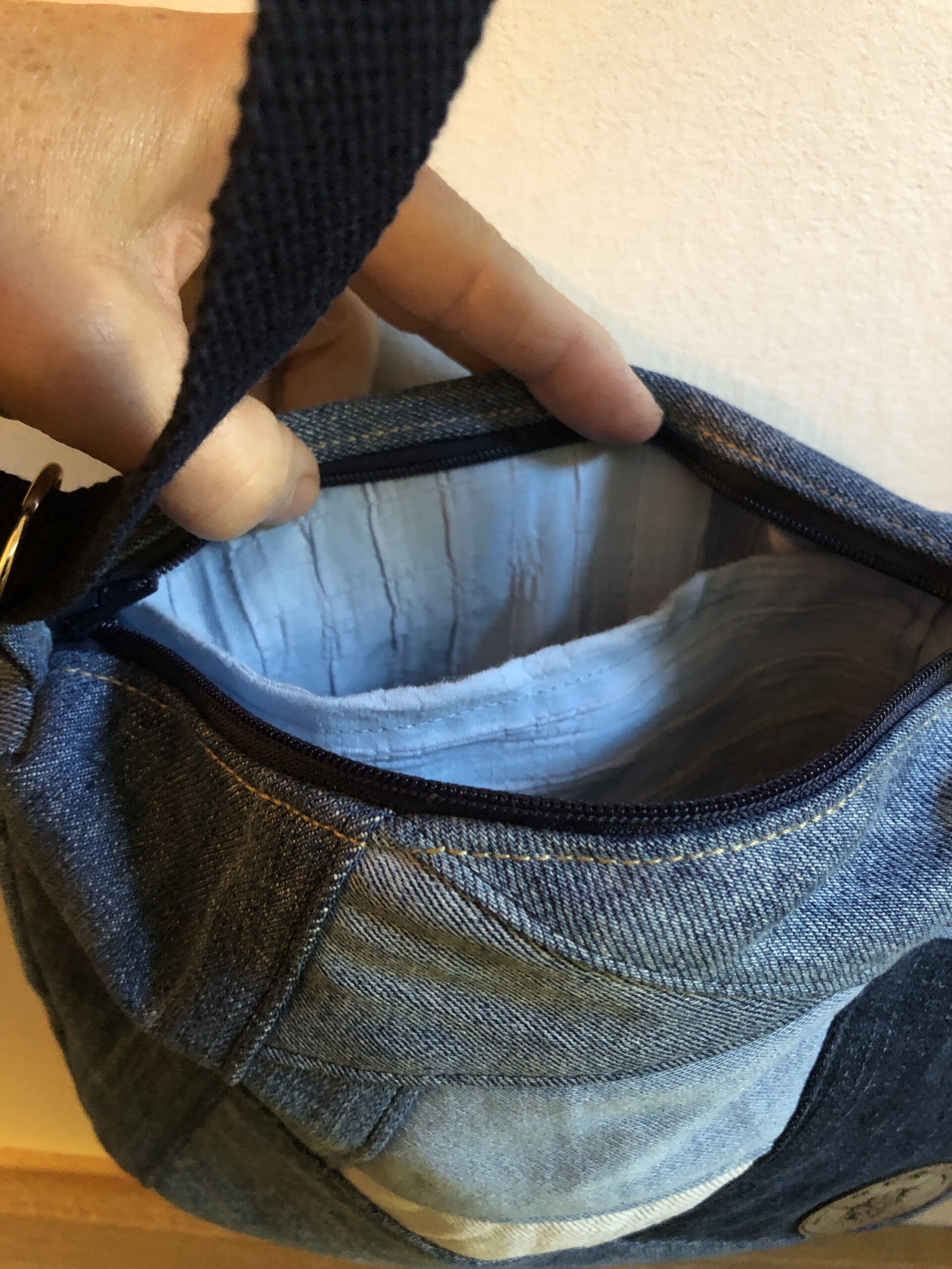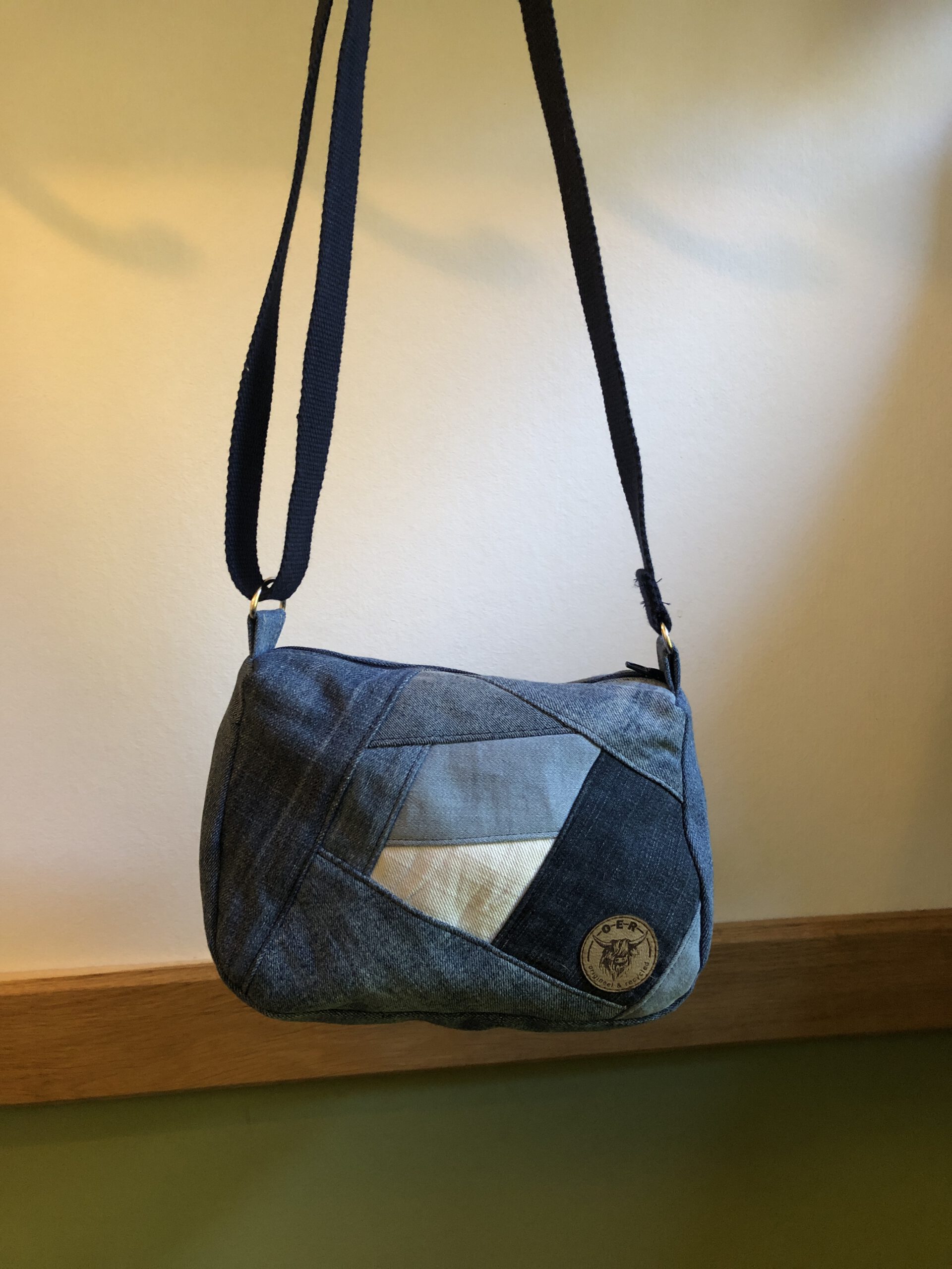 De schoudertas is gemaakt van jeans restanten en heeft aan de buitenkant een ritsvak. De binnenkant is netjes gevoerd en heeft een ritsvak en een insteekvak. De schouderband is van katoen en verstelbaar.